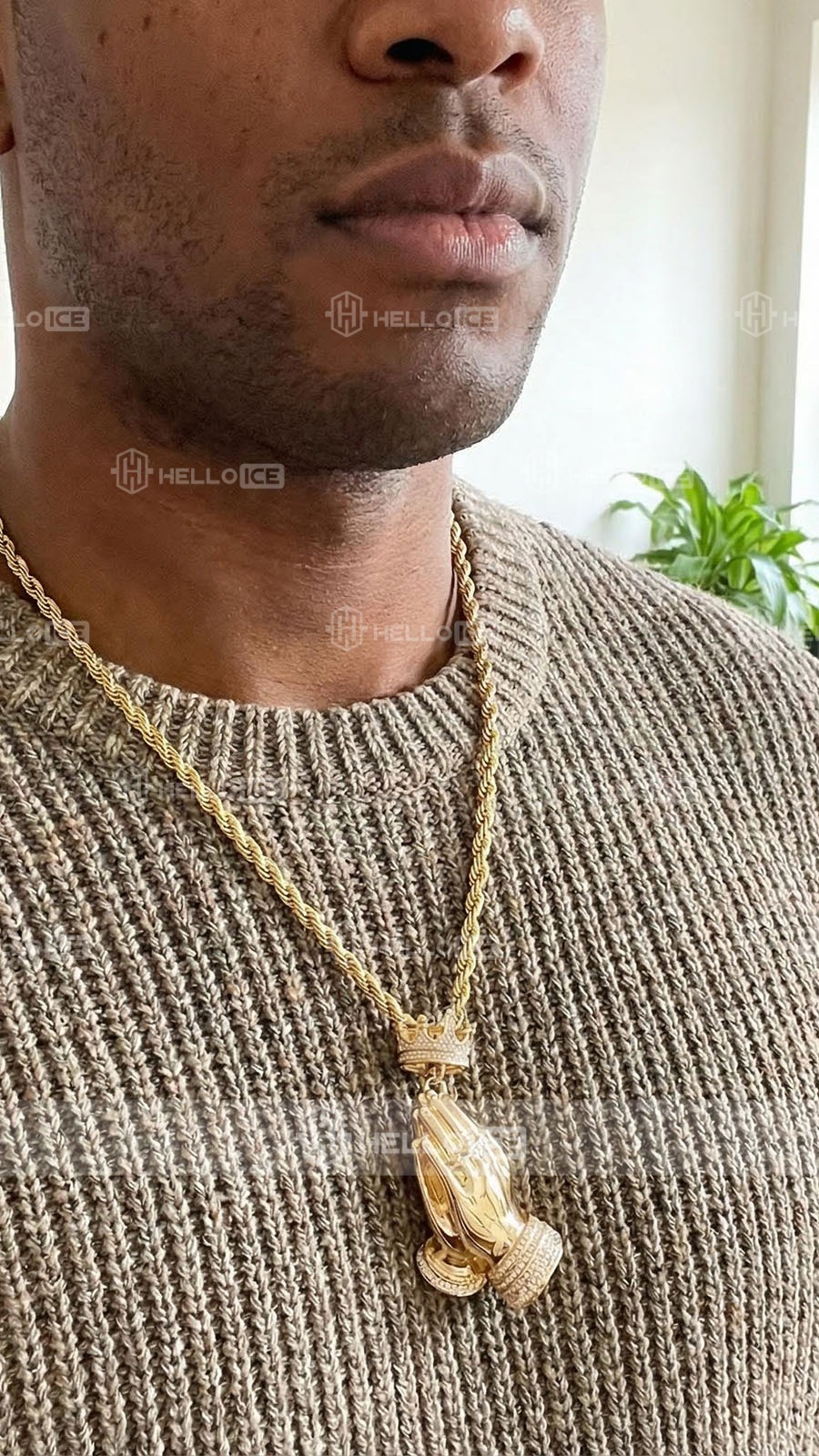 Showcase your style with the Iced Out Praying Hands Crown Pendant, featuring a crown clasp and praying hands adorned with a large diamond ring. This striking piece symbolizes faith and luxury, making it perfect for expressing your unique vibe. Don’t miss out—order now and shine bright!